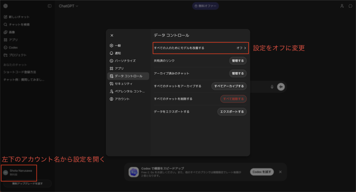ChatGPTはユーザーが入力した会話データを、次のモデルを賢くするための「学習データ」として利用することがあります。