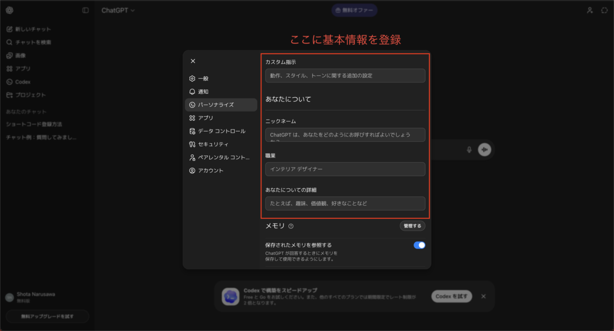 実は、ChatGPTには「あなたの前提条件」をあらかじめ記憶させておく機能があります。