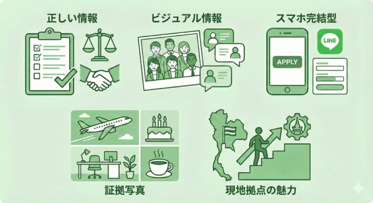 タイ人が仕事を選ぶ際、給与と同じぐらい重視するのが「職場の人間関係」です。文字だけの募集要項では求職者が抱える不安要素は拭えません。スタッフの笑顔が見える集合写真や、実際に働くタイ人社員のインタビューを掲載するだけで、安心感は劇的に高まります。
