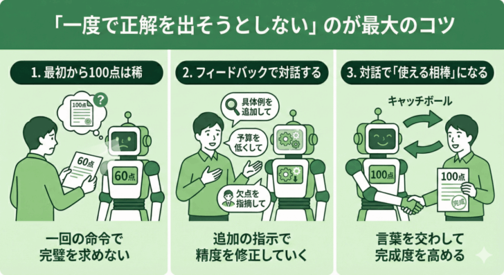 AIとのやり取りは一回命令して終わりではなく、言葉を交わして完成度を高める「会議」だと思ってください。