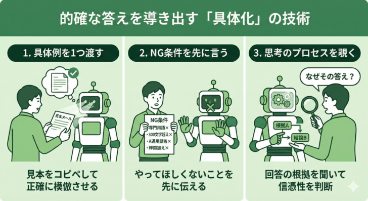 ・「NG条件」を先に言う:「専門用語は使わないで」「300文字を超えないで」といった「やってほしくないこと」を先に伝えます。